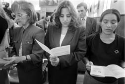 Reporteras que cubren la fuente episcopal rezan durante la misa