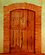 Claro que éste no es el único rasgo distintivo en este tant Donnés... inicial (``inicial'', porque en el Centro Nacional de las Artes hicimos una réplica exacta, en 1995, durante la Cábula Situacionista titulada Domingo 7). Al estar frente ella, el espectador se ve frente a un portón de madera (traída desde Cadaqués, España), y a través de un diminuto agujero se puede apreciar un muro de ladrillos con un boquete por el cual se logra distinguir la figura desnuda de una mujer, con las piernas abiertas, sobre una cama de ramas y sosteniendo en alto con el brazo izquierdo una lámpara de gas. El paisaje del fondo es una cascada bajo un cielo con nubes blancas (de algodón). No le vemos la cara.