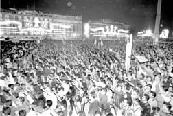 Un helicóptero del Ejército le hace honor al mitin circunvolándolo todo el tiempo, obsesivo como la Fata Morgana de Werner Herzog.