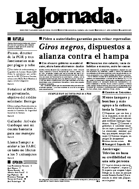 Primera Plana Contraportada Editorial Opinión Suplementos Fotos Cartones de los moneros de La Jornada Búsquedas en La Jornada
