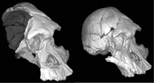 En el lado izquierdo de la gráfica se aprecia la reconstrucción computarizada, en tercera dimensión, del cráneo del primer homínido, y en el ángulo derecho su imagen-espejo, también en tercera dimensión, incluyendo las partes faltantes. Se trata del cráneo del señor Ples, un Australopitecus africanus, especie prehumana de homínidos que data de unos 2.8 a 2.6 millones de años. Las pruebas mostraron que la capacidad del cráneo del señor Ples es de 515 cc, menor que lo calculado originalmente en un rango de 600 cc. Es importante considerar que la capacidad craneana del Homo sapiens se sitúa en un promedio de 1200 cc para los adultos. Si resulta que los Australopitecus tenían el cerebro más pequeño, los paleontólogos pueden encontrarse con que el salto hacia masas encefálicas mayores no se produjo con la aparición del Homo habilis, y los especialistas tendrían que replantearse el modelo evolutivo de ese órgano Ť Foto: revista Science/Reuters