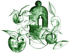 Inscrita por doquier con lujos áureos, hasta sacudir de su entorno cualquier otra imagen animal o vegetal, la escritura, mirándose en sí misma por sus curvas, se percibe mujer, más aún que la voz. Con su sola presencia indica dónde comenzar, dónde perderse; propone, por el canto que ahí anida, aria para la danza y cilicio para el ascetismo; hablo de la escritura árabe de la que me ausento como de un gran amor. Esta escritura que, por mi parte, únicamente he dominado para las palabras sagradas, está aquí exhibiéndose frente a mí bajo una piel de inocencia, en forma de rejillas murmurantes -a partir de ese momento, las otras escrituras (la francesa, la inglesa o la griega) sólo pueden parecerme parlanchinas, nunca cauterizantes, navíos portadores de verdad, ciertamente, pero de una verdad mellada.