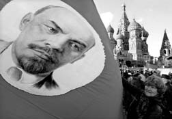 Una moscovita agita en la Plaza Roja una bandera con la efigie de