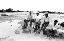 Trabajadores que reconstruyen un puente sobre el río Novillero,