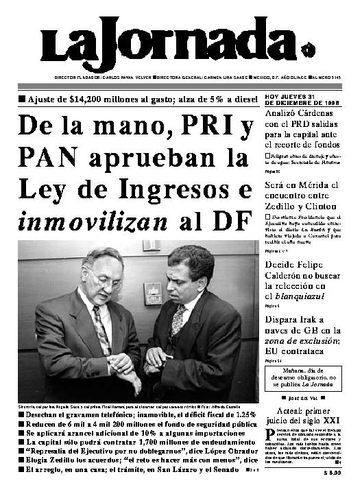 Sus amigos de La Jornada y de la Coordinación de Sistemas le deseamos a usted lector un FELIZ AÑO NUEVO con prosperidad y éxito para 1999