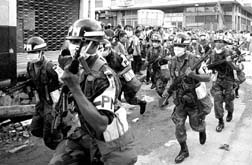 Miembros de la policía militar cargan contra saqueadores en una calle