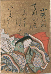 Komachi Ono: Es una poeta perteneciente a la Era Heian, no se sabe cuándo nació ni cuando murió. Dicen que era de una belleza incomparable; existen varias leyendas sobre su hermosura. Una de esas leyendas dice que Komachi, aún aferrada al orgullo de la belleza que tuvo en sus tiempos de juventud, cayó en la miseria hacia el final de su vida; y así, ignorada y sola en una provincia lejana, murió al fin en medio de la tristeza.