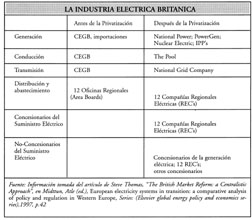 Recientemente, el economista David Newbery presentó un reporte acerca del progreso de la privatización de la industria eléctrica británica. En términos generales, el autor argumenta que ``el experimento inglés ha sido muy positivo, pero ahora se encuentra ante el riesgo de caer en las viejas prácticas y vicios de la política energética''(7).