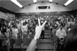 Con un auditorio ocupado por cerca de 400 delegados ųentre estudiantes, académicos, trabajadores y padres de familiaų, los participantes en el encuentro aprobaron la jornada nacional consistente en enviar brigadas de información sobre el conflicto en la UNAM a todas las universidades e instituciones de educación media y superior del país, con la finalidad de que se sumen al movimiento. Por lo pronto, el delegado del Colegio de Bachilleres anunció que el próximo miércoles el plantel cinco hará un paro y una consulta entre los otros 19 centros escolares de esa institución sobre el cobro de las cuotas y la huelga en la UNAM.
