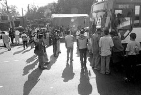 Estudiantes paristas del CCH Vallejo toman un autobús para dirigirse al módulo del Programa Emergente de Apoyo Académico (de clases extramuros promovidas por las autoridades universitarias) e impedir que otros alumnos se registraran n Foto: José Antonio López