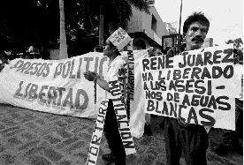 Este domingo, integrantes del comité de familiares y amigos de presos políticos realizaron una marcha por la costera Miguel Alemán para exigir la libertad de más de 20 reclusos internados en los penales de la entidad n Foto: J. Guadalaupe Pérez