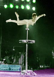 Ya dos chinas hacen equilibrio con unos platos y tazas en su cabeza, acto que requiere, como todos los demás, de una gran concentración, pero Lei Ming y Xie Shang lo hacen parecer como si fuera tan fácil como rebanar un pan. Chuy, por su parte, hace actuar a un pequeño mandril que no es cualquier chango, sino uno menos amaestrable que sus congéneres.