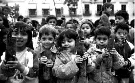 Al festejar el Día del árbol, el gobierno municipal organizó la siembra de retoños en el zócalo de esta ciudad para crear conciencia ecológica en los niños * Foto Javier Verdín