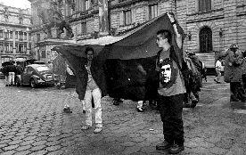 Afuera del Palacio de Minería, donde se desarrolla el encuentro entre paristas y autoridades, dos jóvenes se resguardan de la lluvia * Foto: Cristina Rodríguez