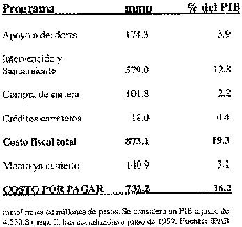 Los distintos programas de apoyo a deudores generaron un costo, hasta junio pasado, de 174 mil 300 millones de pesos, equivalente a 3.9 por ciento del PIB; por intervención y saneamiento, 579 mil millones (12.8 por ciento del PIB); compra de cartera, 101 mil 800 millones (2.2 por ciento del PIB), y por el rescate carretero, 18 mil