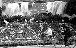 La policía china ha incrementado la vigilancia en Pekín y en la plaza Tiananmen al acercarse las celebraciones, el próximo viernes, del 50 aniversario de la fundación de la República Popular China. Este miércoles, los uniformados retiraron a un pequeño grupo de presuntos miembros de una secta proscrita. Las autoridades impusieron fuertes medidas de seguridad para evitar disturbios durante el desfile de este viernes, en el que participará medio millón de personas, entre otros actos. En la imagen, parte del decorado que ya está instalado en Pekín con motivo de las celebraciones n Foto: Ap