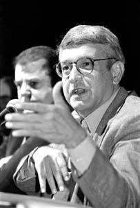 Andrés Manuel López Obrador en la presentación de su libro sobre el Fobaproa. Al fondo, Carlos Fernández-Vega, uno de los comentaristas Ť Foto: José C. González