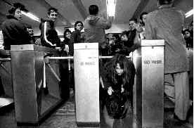 Paristas de la UNAM obstruyen los torniquetes en la estación Bellas Artes del Metro, donde dejaron pasar a los usuarios sin boleto Ť Foto: Cristina Rodríguez