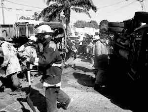 Un aparatoso percance ocurrió la mañana de ayer cuando un carro de volteo se impactó contra un camión de la Cervecería Superior, en el que resultaron dos lesionados. Los bomberos municipales tuvieron que intervenir debido a que los tanques de gasolina de ambos vehículos se rompieron Ť Foto: Agrasur/María de Jesús Peters