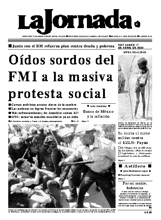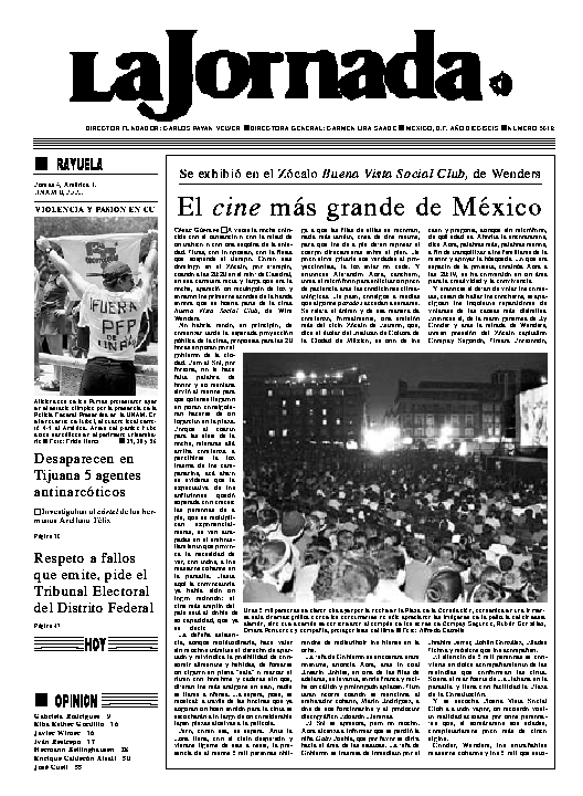La Jornada, Coordinación de Sistemas Francisco Petrarca 118, Col. Chapultepec Morales, delegación Miguel Hidalgo México D.F. C.P. 11570 Teléfono (525) 262-43-00, FAX (525) 262-43-56 y 262-43-54