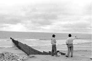 Dos posibles indocumentados esperan turno para cruzar al otro lado en Playas de Tijuana, Baja California Ť Foto: Elsa Medina