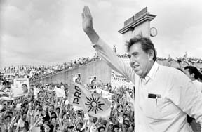 Más de 50 mil tabasqueños se reunieron en la plaza de armas de Villahermosa en lo que representó la mayor concentración de apoyo a Cuauhtémoc Cárdenas, candidato presidencial de la Alianza por México, quien anunció el respaldo a su campaña de 23 mil maestros otrora militantes del PRI. El perredista criticó el ``pacto de unidad'' entre Francisco Labastida y Roberto Madrazo Ť Foto: Pedro Valtierra