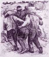 Leamos el viejo cuaderno del artista: Vi a un grupo de indios en Papantla; tomaban unas paletas heladas de colores vivísimos que se relacionaban con los fuertes colores de los listones de los sombreros de los hombres y en el tocado de las mujeres, y en sus trajes. Y aunque parece un chiste, cuando se comieron las paletas, se acabó el cuadro. Se había desbaratado un complicado andamiaje de color. Para ser confidente de lo insólito, hay que estar alerta, perseguir con avidez la incesante recreación de la vida. Más que poner el ojo natural, hay que abrir el alma a la sorpresa. Entonces la realidad se vuelve dócil a la intención lírica; ritmos, volúmenes, color, pasan a ser otra realidad, fascinante en la medida que en su vientre sólo se decantan las esencias, extractos dulces o amargos de lo real. Un grupo de leñadores, una mujer que descansa en su hamaca, dos cazadores que en mitad de las sombras llevan consigo el pendiente fruto de su labor ya no son propiamente escenas reales, sino visiones, metáforas de la laboriosidad, el reposo, el sacrificio. O pueden serlo, ya que las metáforas, como la vida, son equívocas y a menudo se burlan de nosotros. En Cascada con hojas de piñanona (1980), imagen de la Tzaráracua, el agua puede ser también leche, semen, licor de vida que se derrama para fluir después, sin finalidad, como el devenir del mundo. Las significaciones importan menos que el efecto que produce la visión lírica: convertir lo cotidiano en emblema de la magnificencia. Un montón de viejos utensilios se transforma en la Torre de Babel (1987); una Silla con sandías (1991) es a la vez un compendio de la armonía universal. Porque nada es desdeñable como materia del poema. Ni el pescador destazando al hermoso animal ni un par de mujeres auxiliándose para transportar un cántaro, ni un hombre ataviado con sus gallinas muertas, ni el fumador a punto de encender su cigarrillo, ni el bodegón de mil maneras dispuesto; nada es desdeñable digo si el pintor accede a que la imagen lo hiera, deje sus cicatrices, sus marcas como esos árboles añosos que él, el artista, ordenando con minuciosidad las formas, pinta, graba, transforma en lujosas manchas de color, en graciosas líneas que nos regalan una síntesis de lo perdurable. Pero no todo es hambre lírica, abundan también la incandescencia y la ponzoña, que destilan en la magnífica composición de Los abogados (1952) que pasan ocultando sus rostros por encima del cuerpo del cliente defraudado, o en La boda (1983), que nos muestran la escena grotesca de los pobres que recogen el arroz que otros, insolentes, han arrojado al aire.