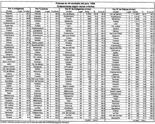 LAS CIFRAS DEL cuadro sorprenderán a muchos como me han sorprendido a mí. Es la primera vez que contamos, hasta donde estoy enterado, con cálculos de pobreza para un número tan alto de ciudades específicas. El análisis apenas comienza aquí. Hay muchas interrogantes sin respuesta, entre otras Ƒpor qué hay tanta pobreza en ciudades aparentemente prósperas como Acapulco? O Ƒpor qué hay mucho menos pobreza en ciudades aparentemente sin dinámica económica como Pachuca?