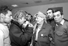 Yasser Arafat, presidente de la Autoridad Nacional Palestina, escucha a los pacifistas que permanecen junto a él como un escudo humano en el sitiado cuartel de Ramallah. Los activistas señalaron que al líder se le observa ``débil y desamparado'' FOTO AFP