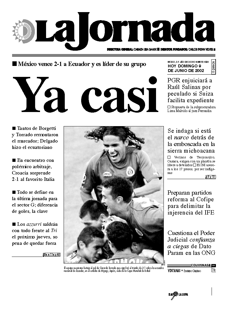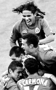 El equipo mexicano festeja el gol de Gerardo Torrado que significó el triunfo de 2-1 sobre la escuadra nacional de Ecuador, en el estadio de Miyagi, Japón, sede de la Copa Mundial de futbol FOTO AFP