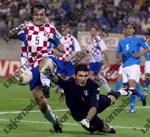 | Italian goalkeeper Gianluigi Buffon (R) deflects the ball in front of Croatian midfielder Milan Rapaic during the Group G first round match Italy/Croatia of the 2002 FIFA World Cup in Korea and Japan, 08 June 2002 at Kashima Ibaraki stadium. Croatia won 2-1. AFP PHOTO PHILIPPE HUGUEN |