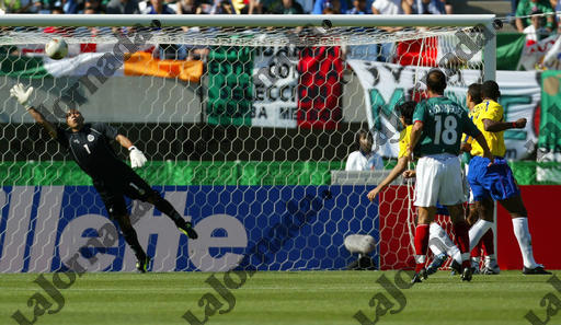 | Ecuador\'s forward Agustin Delgado (R) scores a goal as Mexico\'s goalkeeper Oscar Perez reaches for the ball during their group G match at the World Cup Finals in Sendai June 9, 2002. In the foreground is Joahan Rodriguez (18). REUTERS/Dylan Martinez |