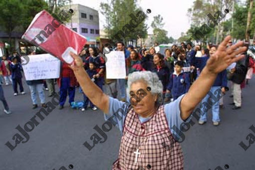 | Padres de familia y estudiantes de la Escuela Participacion Social numero 4 de las calles de Plomo y Pozo protestaron para la destitucion del director Raymundo Ramirez Hernandez debido a los malos tratos que reciben del funcionario, el 11 de junio del 2002. LA JORNADA/ Jose Carlo Gonzalez |