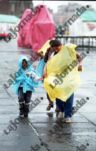Una familia se proteje de la fuerte lluvia de esta tarde en lel zocalo capitalino el 12 de junio del 2002. LA JORNADA/ Jesus Villaseca