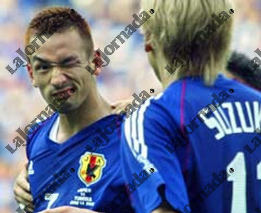 | Japan\'s midfielder Hidetoshi Nakata winks at forward Takayuki Suzuki (R) after match 45 group H of the 2002 FIFA World Cup Korea Japan opposing Tunisia and Japan 14 June, 2002 in Osaka, Japan. Japan won 2-0; Nakata scored the second goal. AFP PHOTO GABRIEL BOUYS |