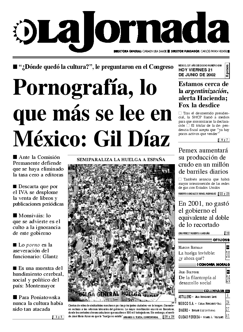 Cientos de miles de sindicalistas marcharon por las principales ciudades -en la imagen, Granada- en rechazo a las reformas laborales del gobierno. La mayor movilización ocurrió en Barcelona, donde las centrales obreras calcularon que acudieron 500 mil trabajadores. Sin embargo, el sentir de José María Aznar es que la ``huelga no existió'' FOTO afp