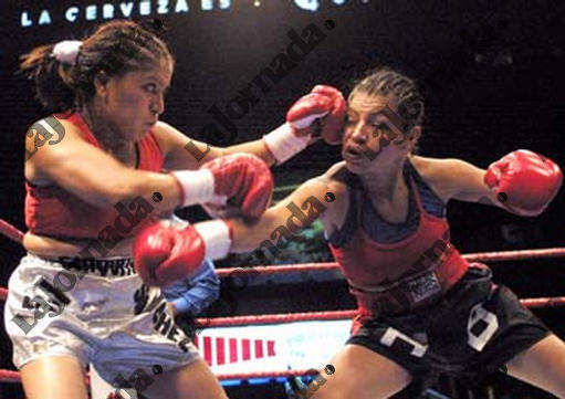 Elizabeth Chiquita Sanchez conecta un izquierdazo a Andres Nena Benitez en la pelea por el primer campeonatofemenil nacional en la historia del boxeo mexicano, donde Sanchez se corono campeona, el 15 de junio del 2002. LA JORNADA/ Jose Carlo Gonzalez