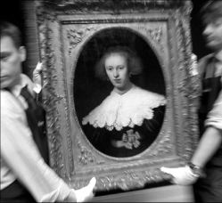 Empleados de la casa subastadora Sotheby´s de Londres transportan un retrato pintado por Rembrandt Hamenz Van Rijn (1606-1669) subastado este viernes y por el cual se esperaba obtener unos 15 millones de dólares FOTO AFP