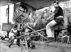 Jóvenes ejidatarios, frente al templete de los inconformes con la construcción del nuevo aeropuerto, en San Salvador Atenco FOTO JESUS VILLASECA