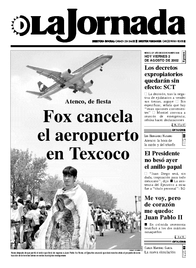 Horas después de que partió el avión que llevó de regreso a Juan Pablo II a Roma, el Ejecutivo anunció que dará marcha atrás al proyecto de construcción de la terminal aérea en varios municipios mexiquenses FOTO CARLOS CISNEROS