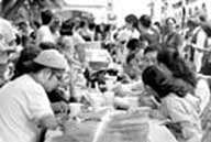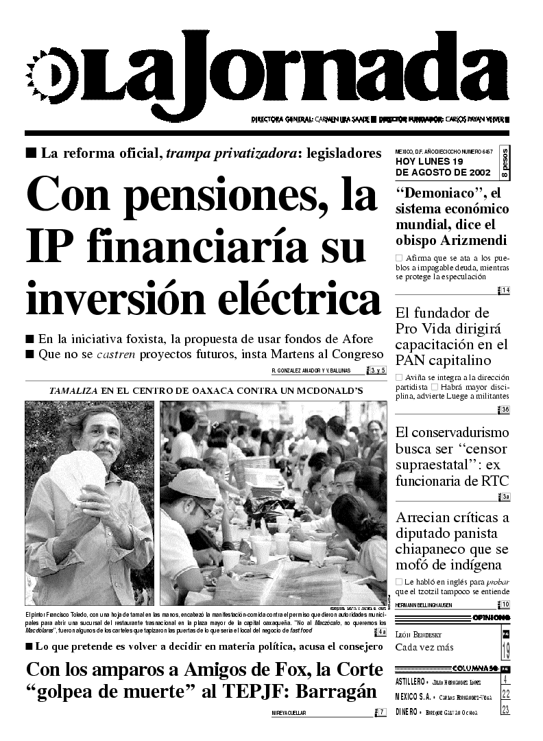 El pintor Francisco Toledo, con una hoja de tamal en las manos, encabezó la manifestación-comida contra el permiso que dieron autoridades municipales para abrir una sucursal del restaurante trasnacional en la plaza mayor de la capital oaxaqueña. ``No al Maczócalo, no queremos los Macdólares'', fueron algunos de los carteles que tapizaron las puertas de lo que sería el local del negocio de fast food FOTOS EZEQUIEL LEYVA Y JACIEL B. CRUZ