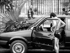 Un conchero se alista al lado de su automóvil
