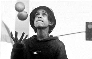 Un muchacho hace acrobacia para recibir limosnas cerca