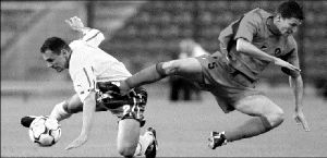 Rodostin Kishishev, de Bulgaria, despoja del balón a Peter Vander, de Bélgica, en el estadio Bruselas FOTO REUTERS