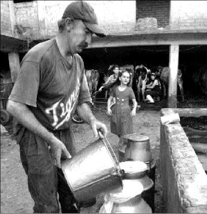 Un trabajador vacía en botes la ordeña de una vaca en un establo de Nezahualcóyotl FOTO MARIA LUISA SEVERIANO