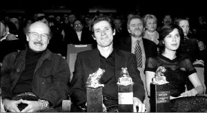 El director alemán de cine Volker Schlondorff, el actor estadunidense Willem Dafoe y la actriz francesa Irene Jacob, durante la entrega de premios Krzysztof Kieslowski, en el Festival Internacional de Cine Camerimage FOTO AFP