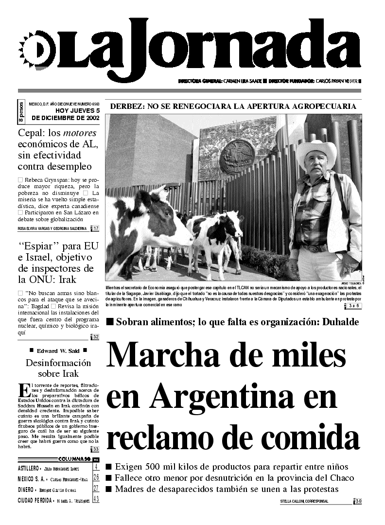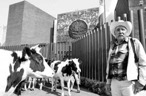Mientras el secretario de Economía aseguró que postergar ese capítulo en el TLCAN no sería un mecanismo de apoyo a los productores nacionales, el titular de la Sagarpa, Javier Usabiaga, dijo que el tratado ``no es la causa de todas nuestras desgracias'' y consideró ``una exageración'' las protestas de agricultores. En la imagen, ganaderos de Chihuahua y Veracruz instalaron frente a la Cámara de Diputados un establo ambulante en protesta por la inminente apertura comercial en ese ramo FOTO JESUS VILLASECA