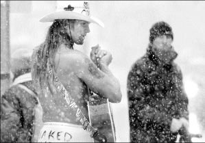 Un artista callejero conocido como el Vaquero Desnudo frota sus manos para poder seguir tocando su guitarra en la primera tormenta de nieve de la temporada que cae en Times Square, en Nueva York FOTO REUTERS
