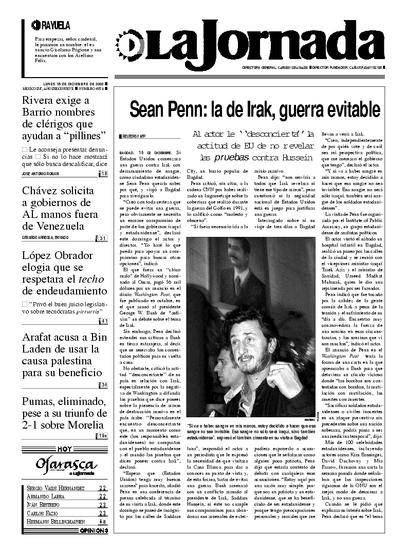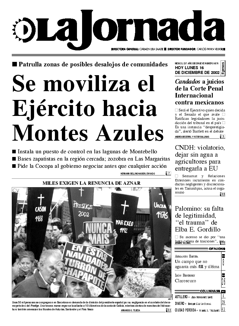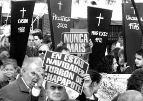 Unas 50 mil personas se congregaron en Barcelona en demanda de la dimisión del presidente español por su negligencia en el combate del derrame petrolero del Prestige. Una tercera marea negra se localizaba a 10 kilómetros de la costa de Galicia, mientras cientos de manchas del hidrocarburo también amenazan los litorales de Asturias, Santander y el País Vasco FOTO AFP