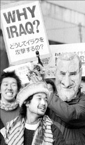 También se podía leer: "Oye Bush, te conocemos bien, tu papá también fue un matón", o bien: "Clausuren la maquina de la guerra". Había mensajes con otra vertiente: "Guerra contra Al Qaeda, sí. No contra Irak".